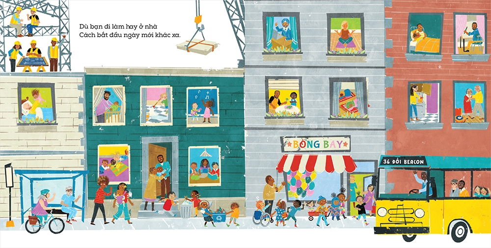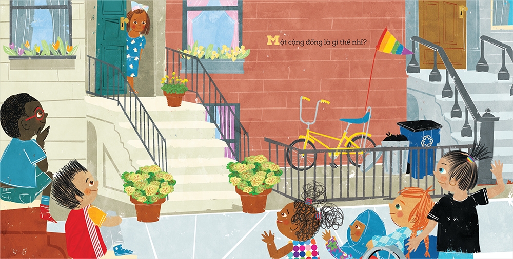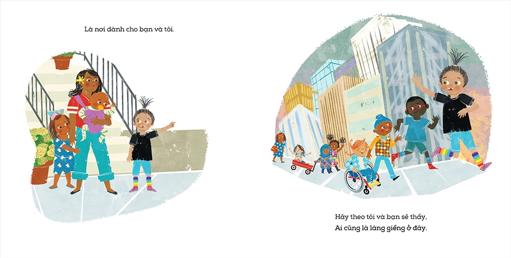 Một cô bé cùng gia đình mới chuyển đến một khu phố và được mọi người trong phố nồng nhiệt chào đón. Hãy theo chân cô bé cùng làm quen với hàng xóm láng giềng, kết bạn, khám phá các cửa hàng, công viên và được đón nhận với những nụ cười và trái tim rộng mở. Trong cuốn sách, trẻ em và người lớn thuộc những sắc tộc, lứa tuổi, khả năng thể chất, mặc trang phục theo những tôn giáo khác nhau, có những sở thích và làm nghề nghiệp khác nhau nhưng đều tương tác và hỗ trợ lẫn nhau trong một cộng đồng thân thiện, tương trợ và văn minh.
