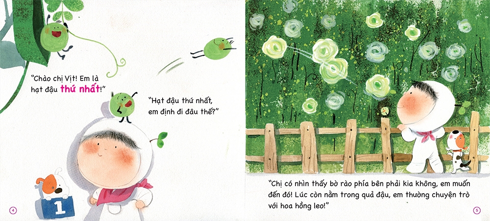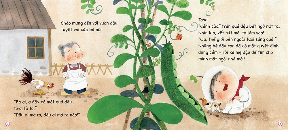 Ồ, quả đậu của bà nội vừa nứt vỏ, các bạn hạt đậu đang muốn ra chơi với Vịt kìa!