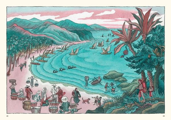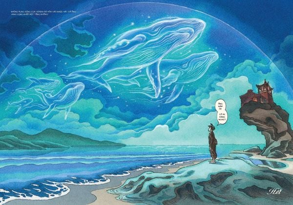 Tác giả cũng dàn dựng ra một làng ven biển miền Trung có đủ thành phần cư dân và những tập tục lâu đời. Ở đấy có ông Tám Đờn, mà trong mô tả bằng lời và tranh thì giống như một người kể chuyện dân gian, mỗi câu hát mỗi lời nói là kinh nghiệm dồn góp, là kiến thức truyền đời, và cả những nỗi lòng của con người giữa thiên địa biển cả.