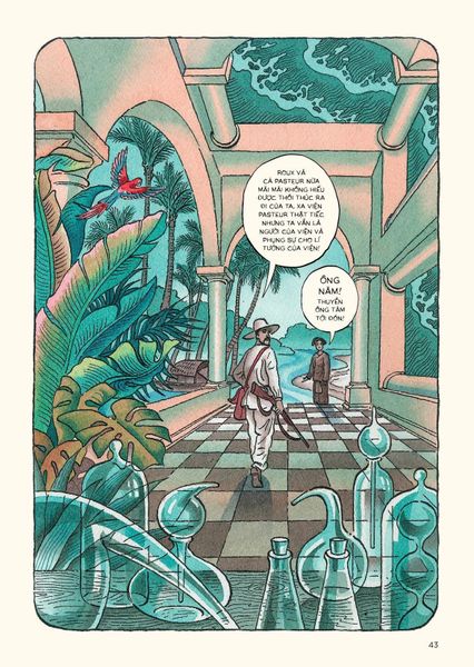 Việc chuyển đổi không gian cũng có nét thú vị. Chỉ trong một bức tranh ở trang 43, Yersin đang bắt đầu rời khỏi viện nghiên cứu Pasteur ở Paris, bỏ lại đằng sau những chai lọ dụng cụ thí nghiệm để bước ra ngoài thì đã thấy chú bé Tín đứng chờ ngay ở cửa với câu nói: “Ông Năm, thuyền ông Tám tới đón”. Bên ngoài khung cửa không phải là Paris, mà là… vùng biển nhiệt đới xứ An Nam. Như là vừa đi một bước đã đến nơi.