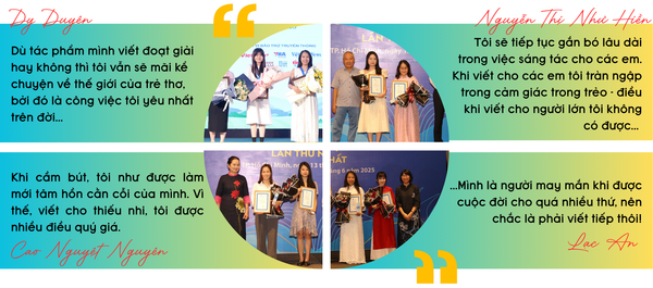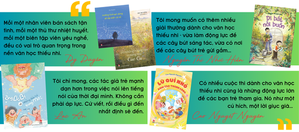 * Có thể thấy rằng, các giải thưởng văn học thời gian qua đã góp phần khích lệ những cây bút trẻ đến với văn học thiếu nhi. Tuy nhiên, để họ có thể phát triển lâu dài, gắn bó bền vững và đóng góp tích cực cho dòng văn học này, có lẽ phải cần thêm những điều kiện hỗ trợ cụ thể hơn. Vậy đâu là những điều thực sự cần thiết?