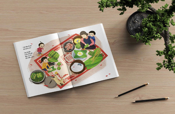 Bộ tranh minh họa bằng màu nước rực rỡ khổ lớn của họa sĩ Kim Duẩn mang đến trọn vẹn một mùa Xuân cho “Kể chuyện Tết Nguyên đán”. Các bức tranh được nghiên cứu chi tiết, miêu tả chân thực rõ nét. Tất cả trọn vẹn hạnh phúc, háo hức chờ đón một mùa Xuân quây quần bên người thân, gia đình và nâng niu Tết yêu thương.