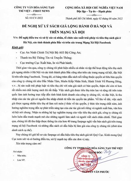 First News đã nhiều lần gửi văn bản đề nghị cơ quan chức năng xử lý tình trạng sách giả tràn lan