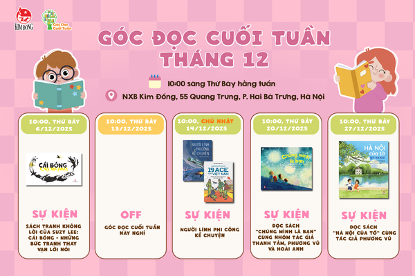 - 10:00, thứ Bảy, 27/12/2025: Đọc sách "Hà Nội của tớ" cùng tác giả Phương Vũ. Một tình bạn gắn bó với nhau bằng thành phố thân thuộc, nơi lưu giữ những kỉ niệm trong sáng, thơ ngây. Chương trình phù hợp với các bạn nhỏ 3-11 tuổi