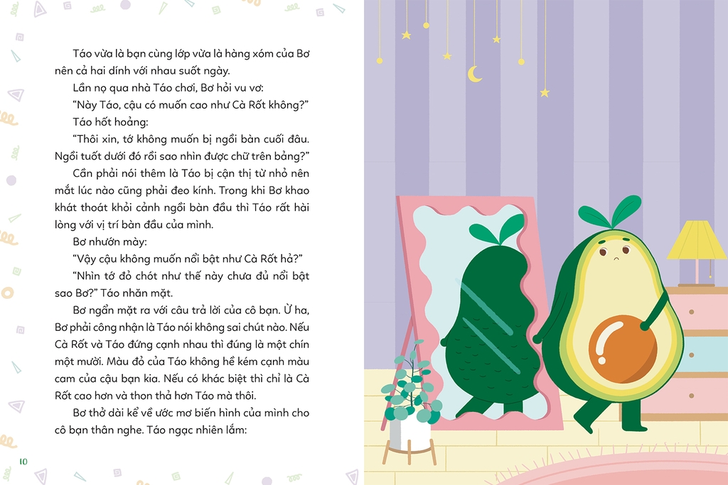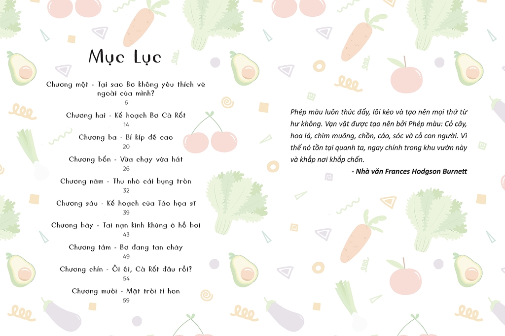 Hãy cùng Bơ mở quyển sách này ra, phát hiện xem bằng cách nào Bơ đã nhận ra bản thân mình thật tuyệt vời, được chính Cà Rốt ngưỡng mộ và yêu mến, bạn nha!