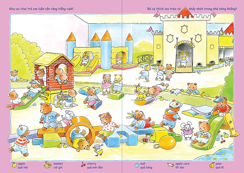 Có rất nhiều thứ để quan sát và tìm kiếm trong những trang sách này. Dù là ở trường, ở sân chơi hay bể bơi… nơi nào cũng thật đông đúc và náo nhiệt! Bé có tìm được vị trí của Bobbi và những hình dưới chân trang không? Hãy nhìn thật kĩ nào!