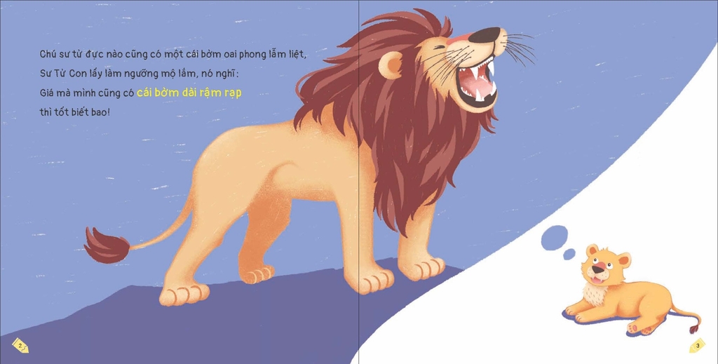 Sư Tử Con mơ màng về chiếc bờm uy nghi, lộng lẫy như những chú sư tử đực khác. Sư Tử Con tưởng tượng những gì thế nhỉ? Bé hãy thử khám phá nào!