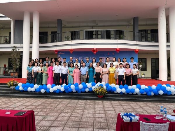 Lãnh đạo phòng Giáo dục Đào tạo huyện Đan Phượng chụp ảnh cùng tập thể thầy cô giáo Trường Tiểu học Đồng Tháp, NXB Kim Đồng và Dự án Sách Nhà Mình.