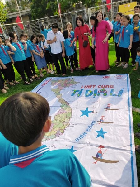 Các em học sinh hào hứng tham gia góc Lướt cùng Tí địa lí.