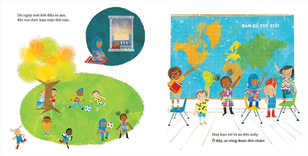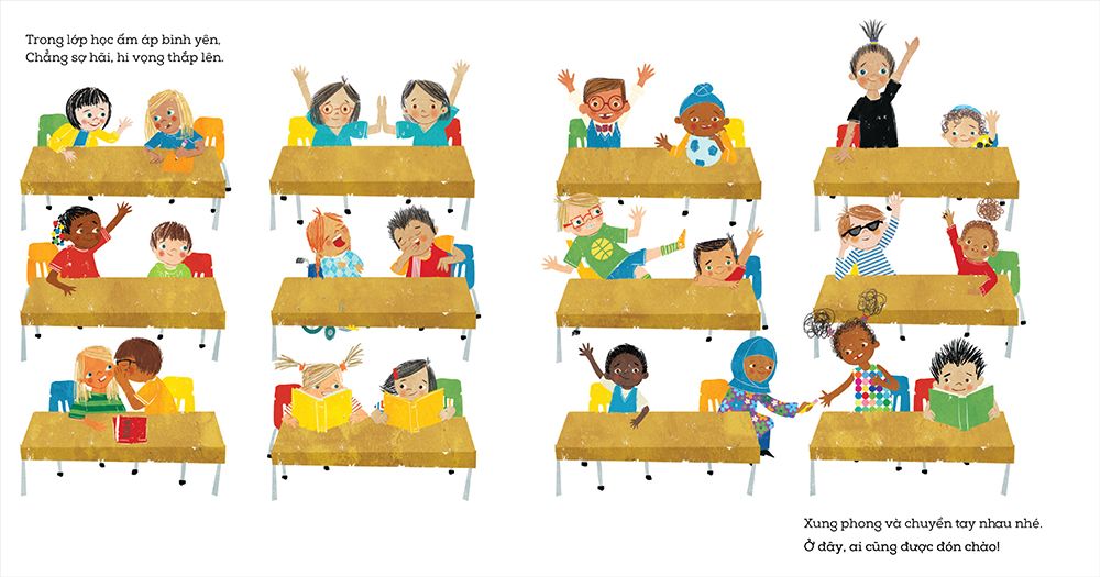 Cùng đến thăm một ngôi trường nơi tất cả các bạn nhỏ đều có một chỗ, một không gian cho mình và được yêu thương, trân trọng. Bạn đọc sẽ dõi theo một nhóm học sinh trong suốt một ngày của các em ở trường, nơi mà mọi người đều được chào đón với vòng tay rộng mở. Một ngôi trường nơi học sinh từ các nền văn hóa khác nhau, với những hoàn cảnh khác biệt học hỏi, tôn trọng lẫn nhau và tôn vinh văn hóa của nhau. Sách minh họa tươi sáng, dễ thương, phần lời có vần điệu.