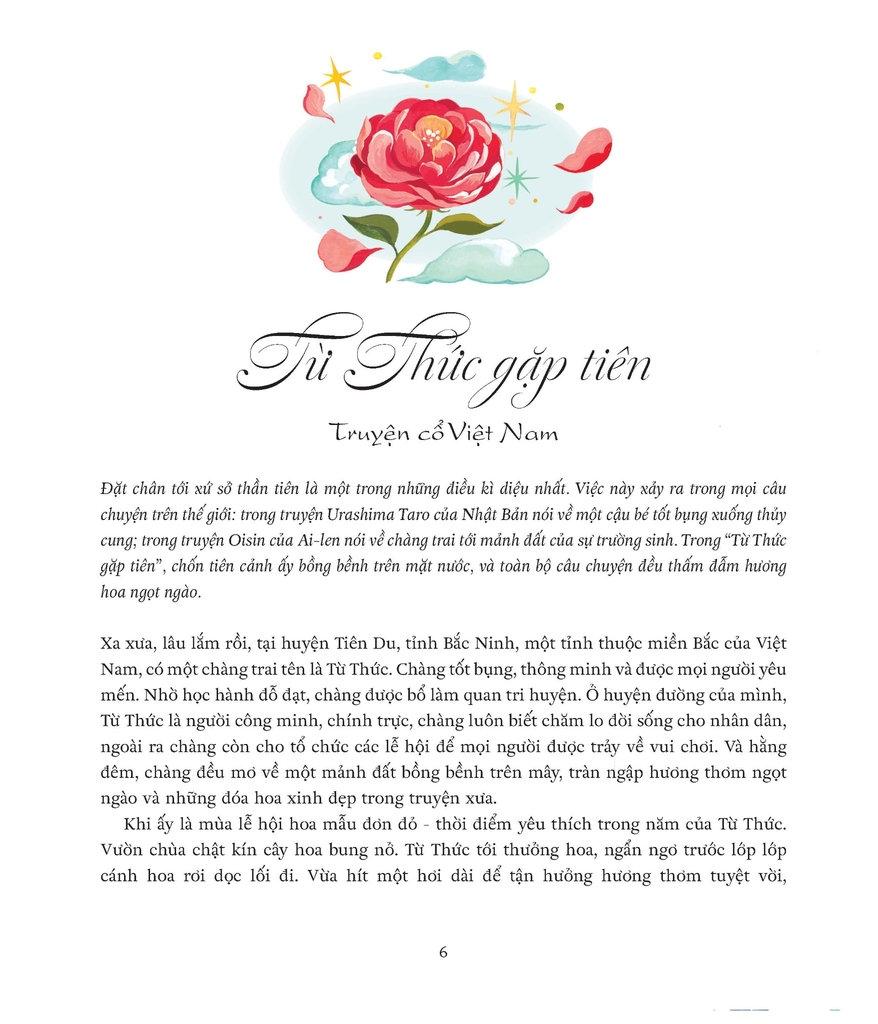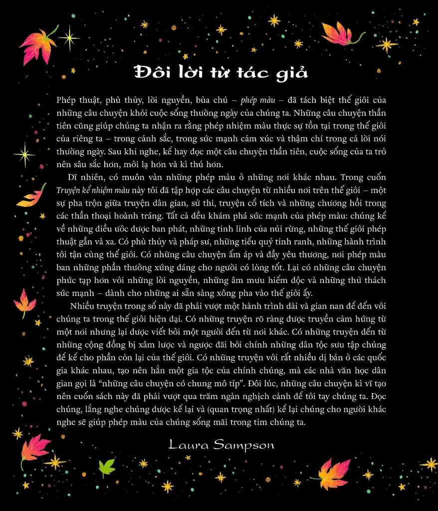 Tuyển tập truyện minh họa tuyệt đẹp này gồm những câu chuyện thần tiên trên khắp thế giới – từ Bắc và Nam Mĩ, châu Âu, châu Phi, châu Á và châu Đại Dương. Được kể lại bởi Laura Sampson với những tác phẩm minh họa cuốn hút của hai họa sĩ Việt Nam - Quang và Liên, đây chính là cuốn sách nhiệm màu đáng được nâng niu bởi nhiều thế hệ.