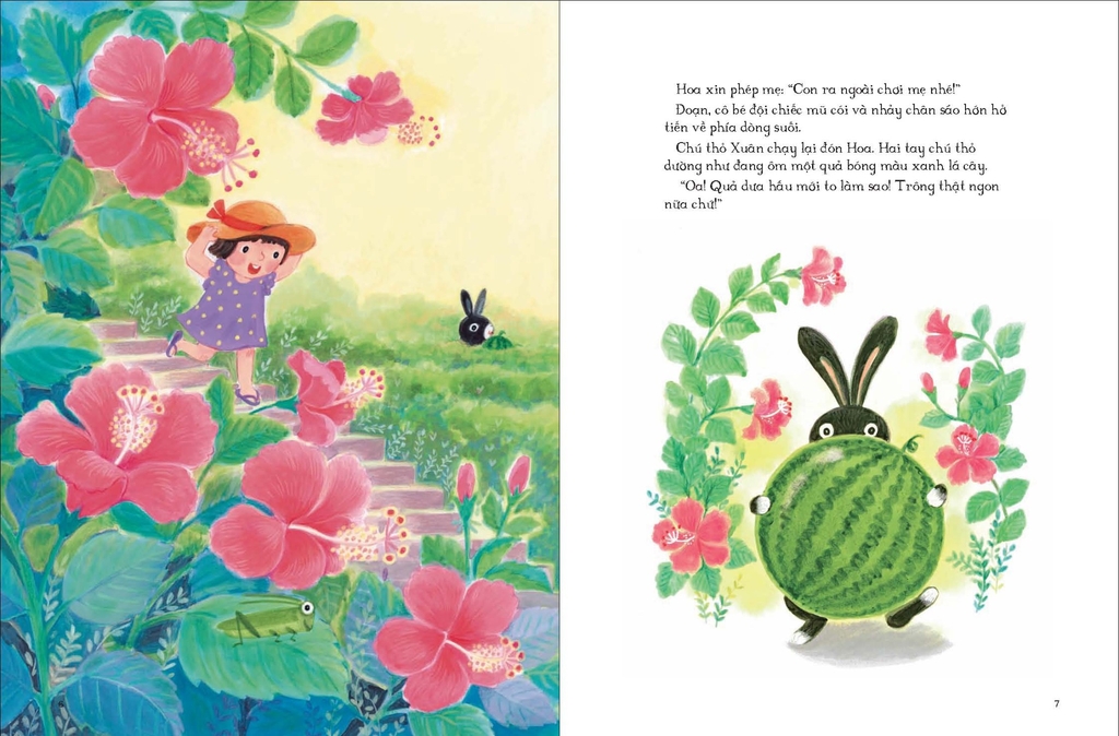 Bé thích làm gì nhất vào mùa hè? Làn nước suối trông thật mát, Hoa muốn ra ngoài dạo chơi. Chú thỏ Xuân ôm một quả cầu màu xanh bóng loáng lại gần, hóa ra đó chính là trái dưa hấu rõ to. Hai bạn cùng nhau vui đùa bên dòng suối và ngâm dưa trong làn nước, định bụng khi nào chơi mệt sẽ thưởng thức những miếng dưa mát lạnh. Ai dè, quả dưa lại trôi đi mất... Phải làm sao bây giờ?